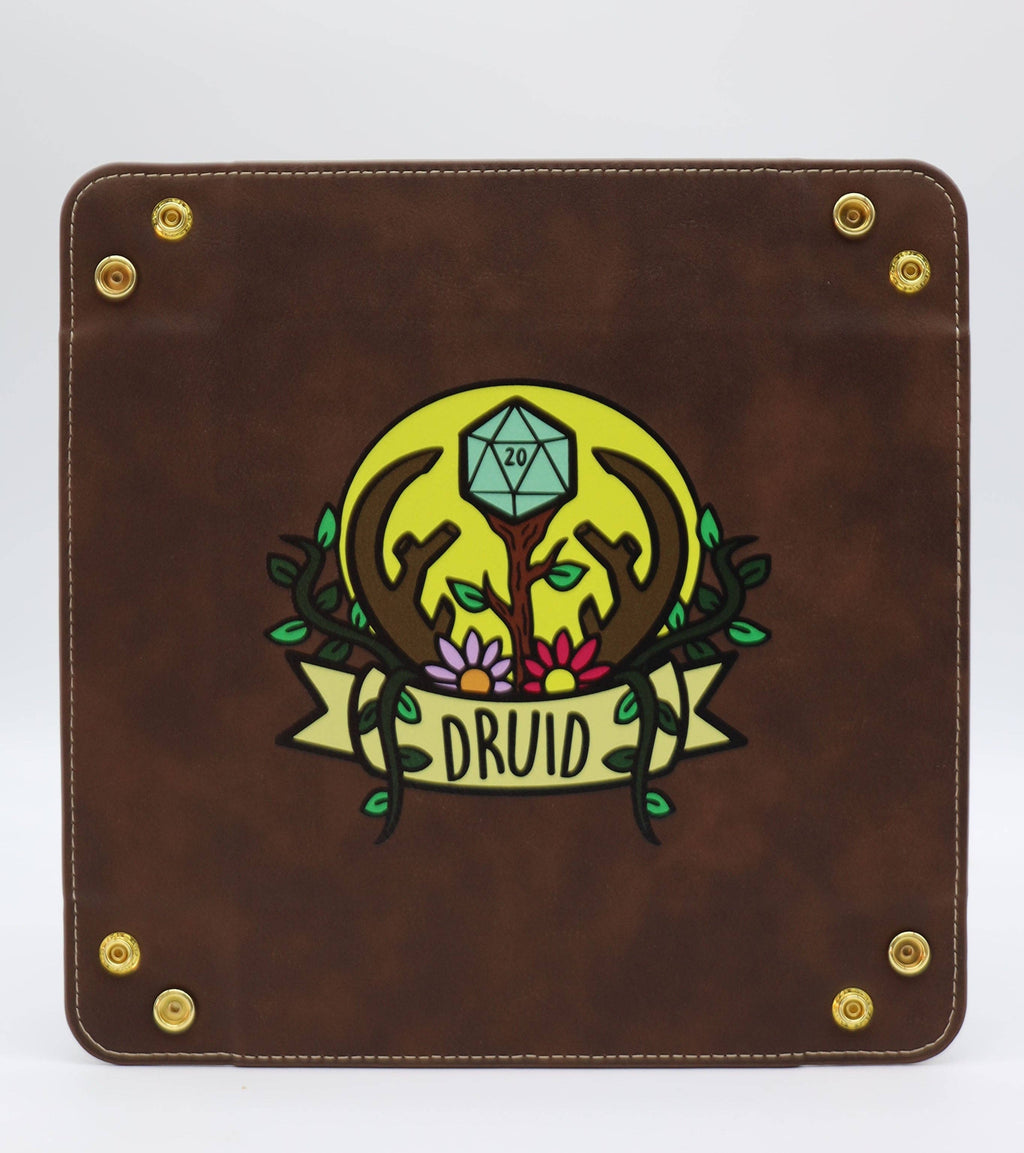 Represent your favorite class with our collapsible dice tray! This dice tray is made with durable leatherette and strong metal snap buttons. It's perfect for the traveling player or Dungeon Master. The tray stays flat and snaps together when you're ready to play!