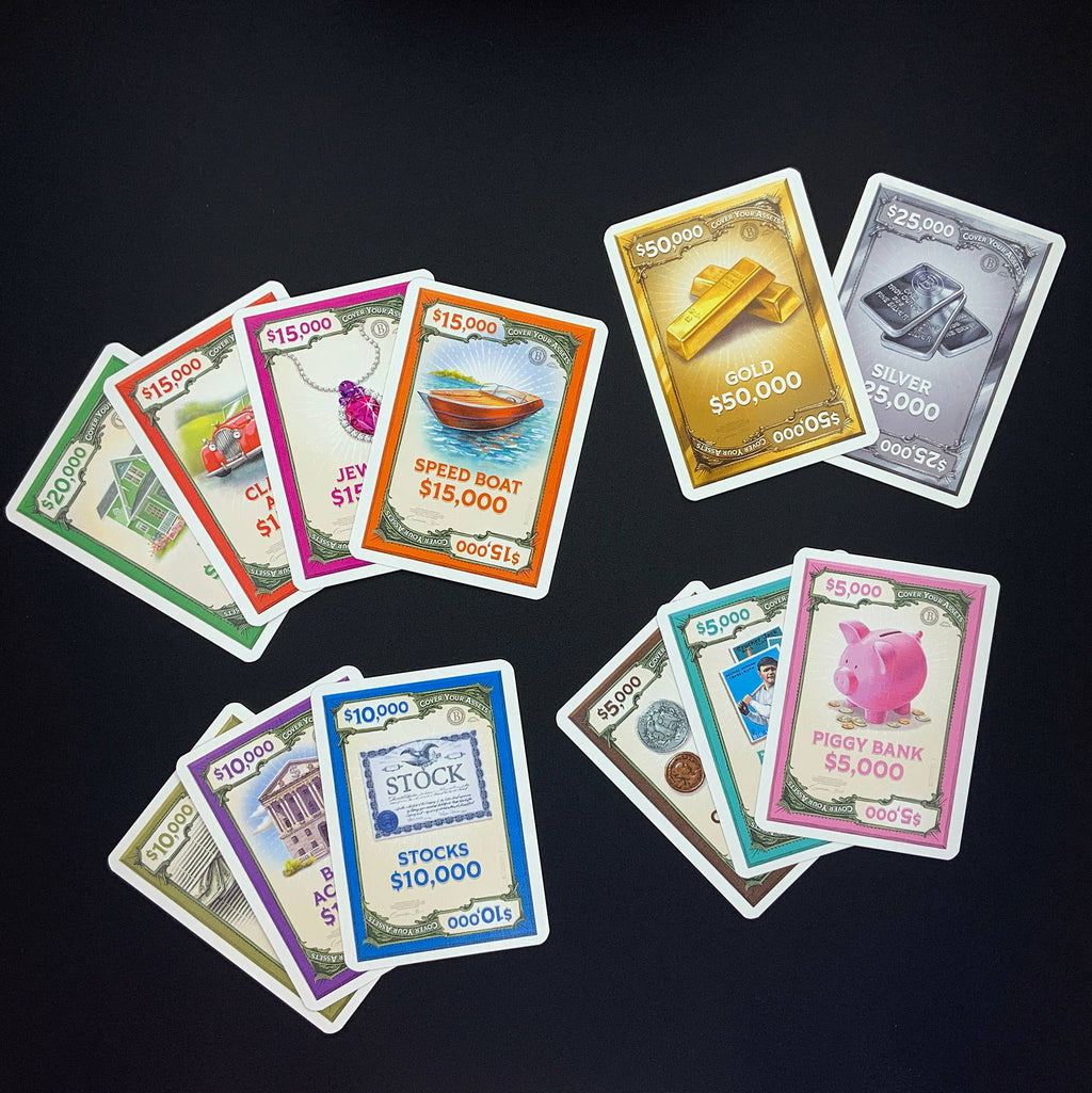 Players: 2-6 | Ages: 7-99 | Minutes: 20-40 Our best selling game! The same gameplay and rules as our original version, and now with updated artwork and optional advanced play. Play just like the original, or add in the advanced cards for a new spin. Create stacks of assets by pairing sets of asset cards, like Piggy Banks, Cash Under the Mattress, Jewels, Classic Autos, and more. Each new set is stacked atop the previous set, literally COVERING your Assets! Watch out though—the top set on every player's pile can be challenged and stolen by other players if they reveal a matching asset, or a Wild Silver or Gold card! You're not defenseless though; you can reveal your own matching assets or wild cards to protect your top set.